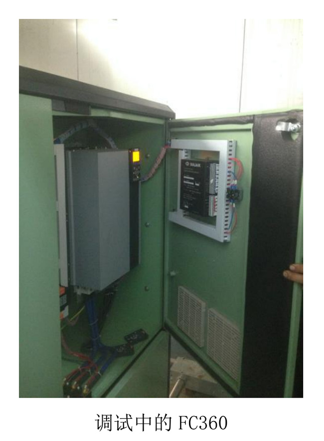 以上兩張圖片是我司在佛山某空壓機應(yīng)用現(xiàn)場所拍,我司的技術(shù)工程師正在調(diào)試FC360變頻器。空壓機變頻調(diào)速控制原理是電動機拖動空氣壓縮機旋轉(zhuǎn),使之產(chǎn)生壓縮空氣,并存儲于儲氣罐中。儲氣罐中空氣壓力的大小取決于空氣壓縮機產(chǎn)生壓縮空氣的能力(本系統(tǒng)中即取決于電動機的轉(zhuǎn)速)和用戶用氣量之間的平衡狀況,為了保證供氣質(zhì)量,要求儲氣罐空氣壓力穩(wěn)定在某一數(shù)值上。儲氣罐內(nèi)的壓力為被控量,壓力變送器將儲氣罐的壓力變換成電信號送給變頻器PID單元,與壓力給定值進行比較,PID能單元根據(jù)比較所得偏差的大小和方向按預(yù)定的 PID 運算規(guī)律運算后產(chǎn)生控制信號改變變頻器的輸出,從而改變電動機的轉(zhuǎn)速,使儲氣罐內(nèi)的實際壓力始終維持在給定值上。