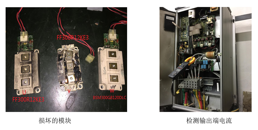 案例二:客戶反映故障報(bào)警“AL15”,為二次側(cè)電源故障,維修二次側(cè)電源電路。修好后現(xiàn)場(chǎng)裝機(jī)試機(jī),檢測(cè)輸出側(cè)三相電源電壓平衡正常,輸出頻率45HZ時(shí)三相輸出電流為135A左右正常。連續(xù)運(yùn)行3小時(shí)左右時(shí)變頻器發(fā)生故障停機(jī),現(xiàn)場(chǎng)檢測(cè)電源驅(qū)動(dòng)板未發(fā)現(xiàn)損壞,開(kāi)關(guān)電源供電電路正常,驅(qū)動(dòng)電路6路未發(fā)現(xiàn)短路、開(kāi)路現(xiàn)象。V相IGBT模塊損壞(型號(hào)為 FF300R12KE3),U、W 正常。