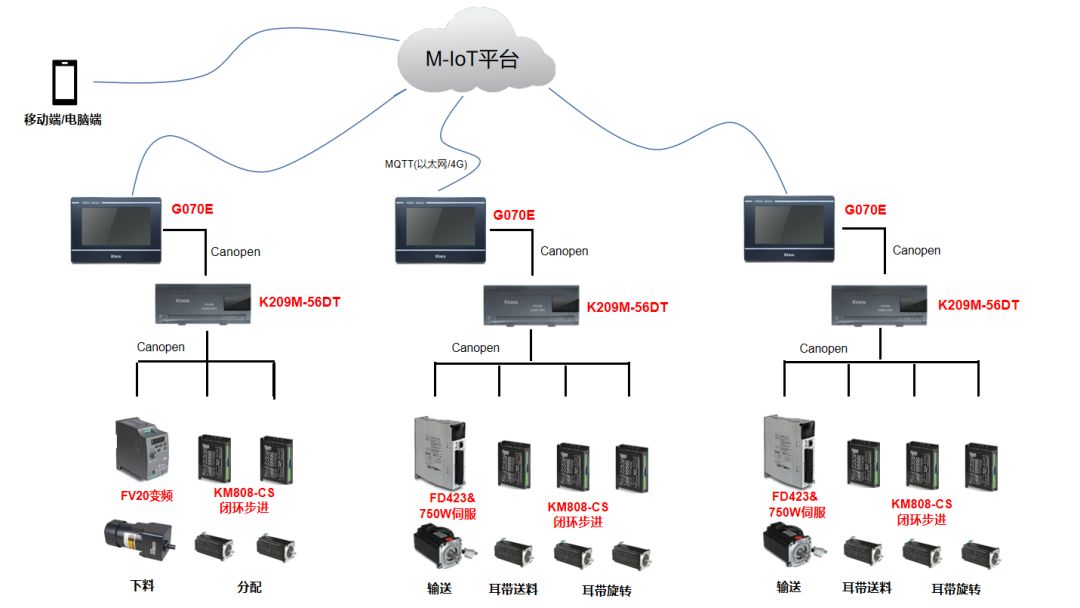 客戶(hù)和設(shè)備商擔(dān)心的就是設(shè)備故障停機(jī),升級(jí)版口罩機(jī)Plus方案通過(guò)互聯(lián)網(wǎng)或4G將整套設(shè)備接入云端的M-IoT平臺(tái),讓設(shè)備上云,足不出戶(hù)就可實(shí)現(xiàn)設(shè)備遠(yuǎn)程診斷,實(shí)現(xiàn)故障及時(shí)排查與預(yù)防性維護(hù)。通過(guò)對(duì)驅(qū)動(dòng)器、電機(jī)、變頻器、PLC、HMI的運(yùn)行數(shù)據(jù)采集,完成對(duì)設(shè)備運(yùn)行健康狀態(tài)的監(jiān)控。
