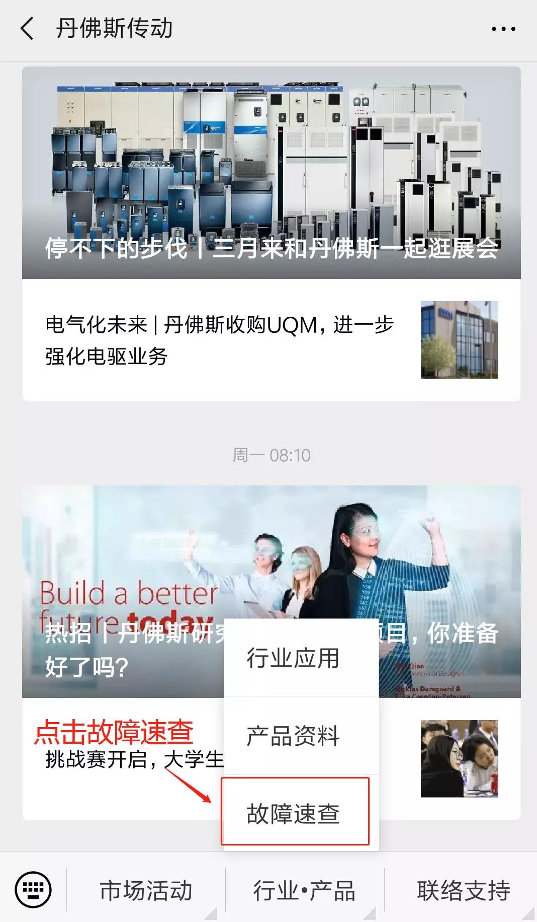 1.在丹佛斯傳動(dòng)公眾號菜單欄,點(diǎn)擊【行業(yè)·產(chǎn)品】,選擇“故障速查”,即可進(jìn)入故障速查首頁。