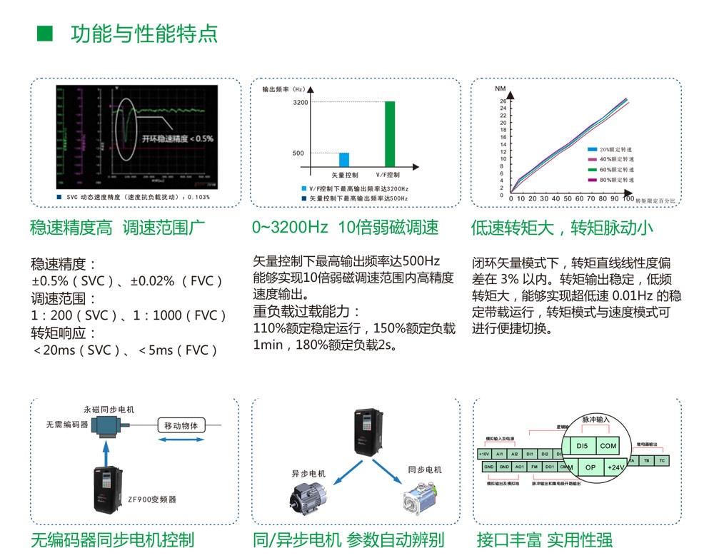 技術特點: 自動轉矩提升及滑差補償功/加減速性能優(yōu)越/支持多種PG卡/穩(wěn)速