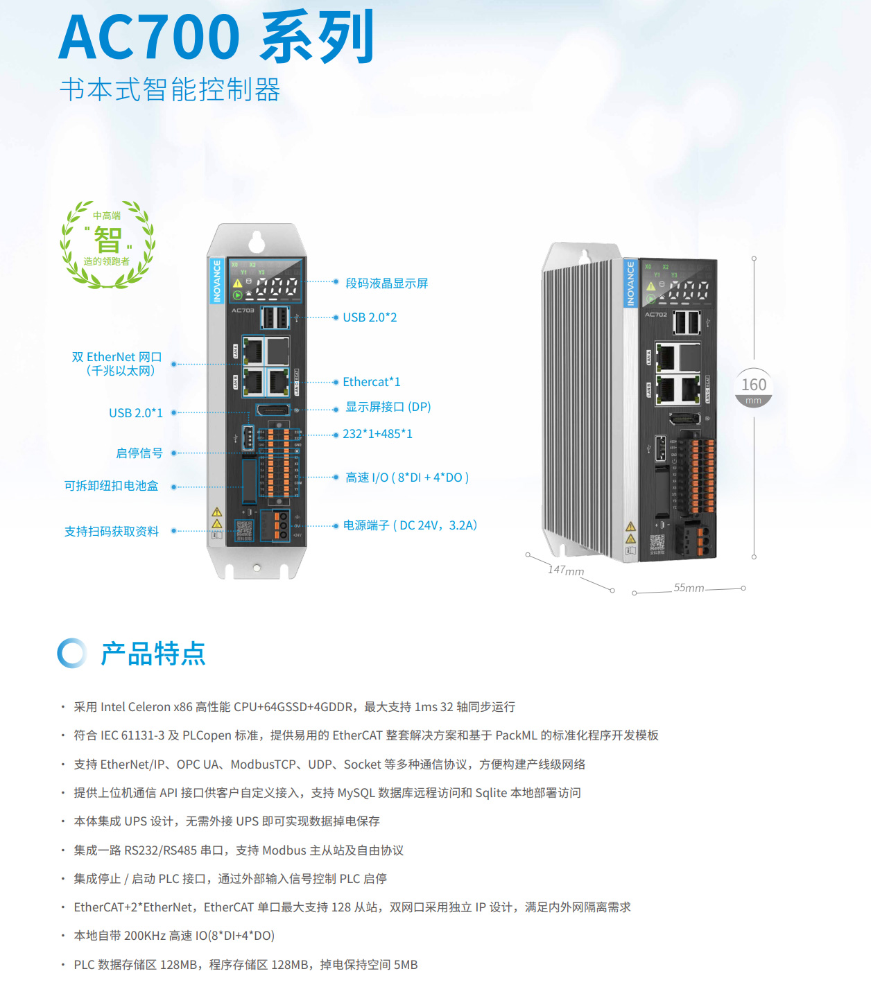 AC700系列書本式智能機(jī)械控制器,是基于Intel X86處理器硬件平臺(tái),符合PLCopen規(guī)范和IEC-61131-3標(biāo)準(zhǔn)的高性能運(yùn)動(dòng)控制器,支持ST,LD,SFC,CFC編程語言。標(biāo)配EtherCAT工業(yè)以太網(wǎng)實(shí)時(shí)總線,可以實(shí)現(xiàn)最大32軸同步控制。全系配置兩路千兆以太網(wǎng)口,支持EtherNet/IP與OPC UA等主流通訊協(xié)議,可以輕松的實(shí)現(xiàn)生產(chǎn)現(xiàn)場與IT系統(tǒng)的數(shù)據(jù)交互。同時(shí),AC700本體集成UPS(不間斷電源),即無需外接UPS即可實(shí)現(xiàn)數(shù)據(jù)掉電保存。匯川在工業(yè)自動(dòng)化領(lǐng)域超過7年的軟件平臺(tái)深度迭代開發(fā)與工藝算法庫積累,使其可以簡單、高效、穩(wěn)定的搭建設(shè)備應(yīng)用程序,尤其在高速、高精、高性能需求的大規(guī)模過程自動(dòng)化、產(chǎn)線自動(dòng)化和工廠自動(dòng)化智能制造領(lǐng)域十分適用。